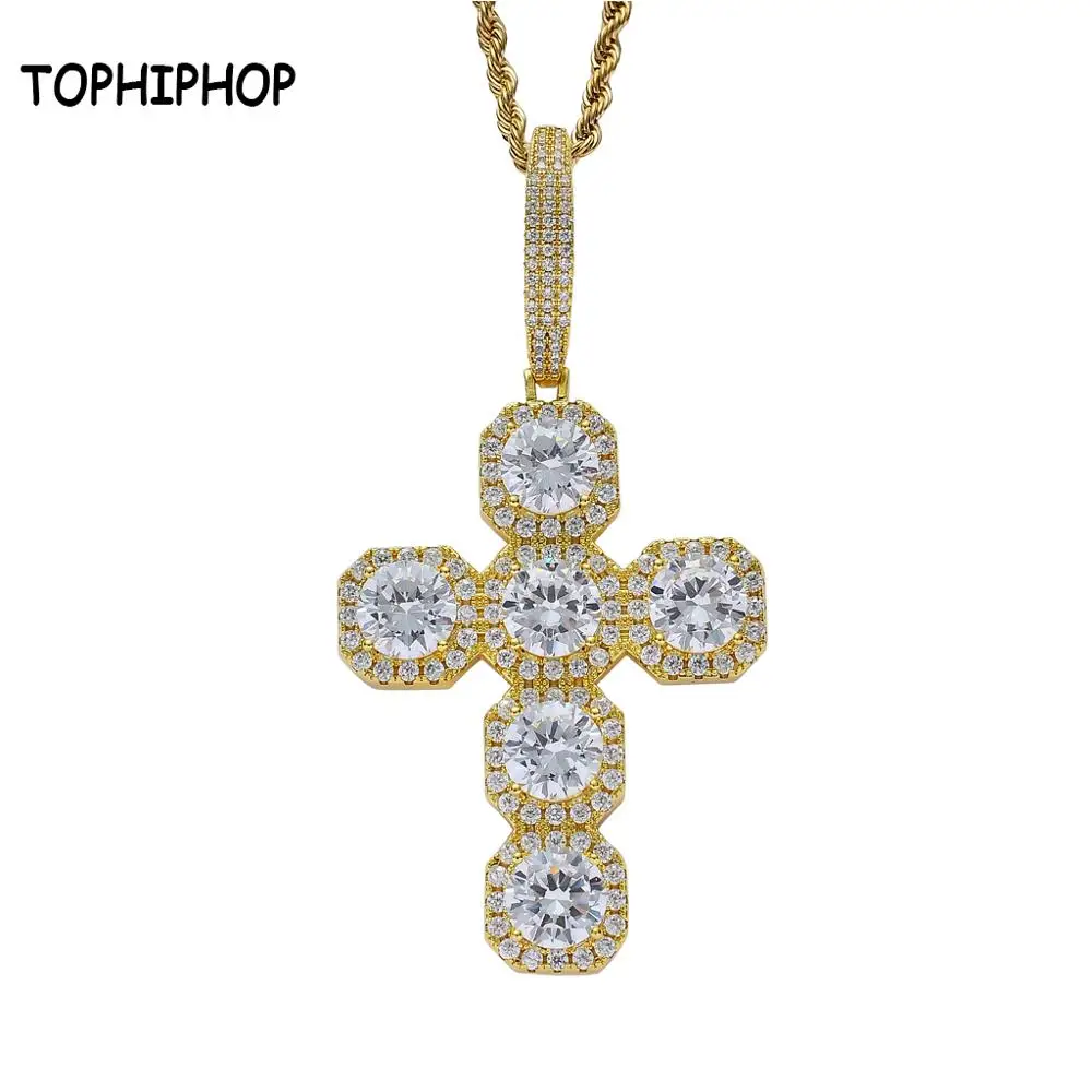 Review Hiphop Jewelry Gold Mens Iced Out Zircon 87mm Big Cross Pendant with Large Clasp Rope Chain Necklac