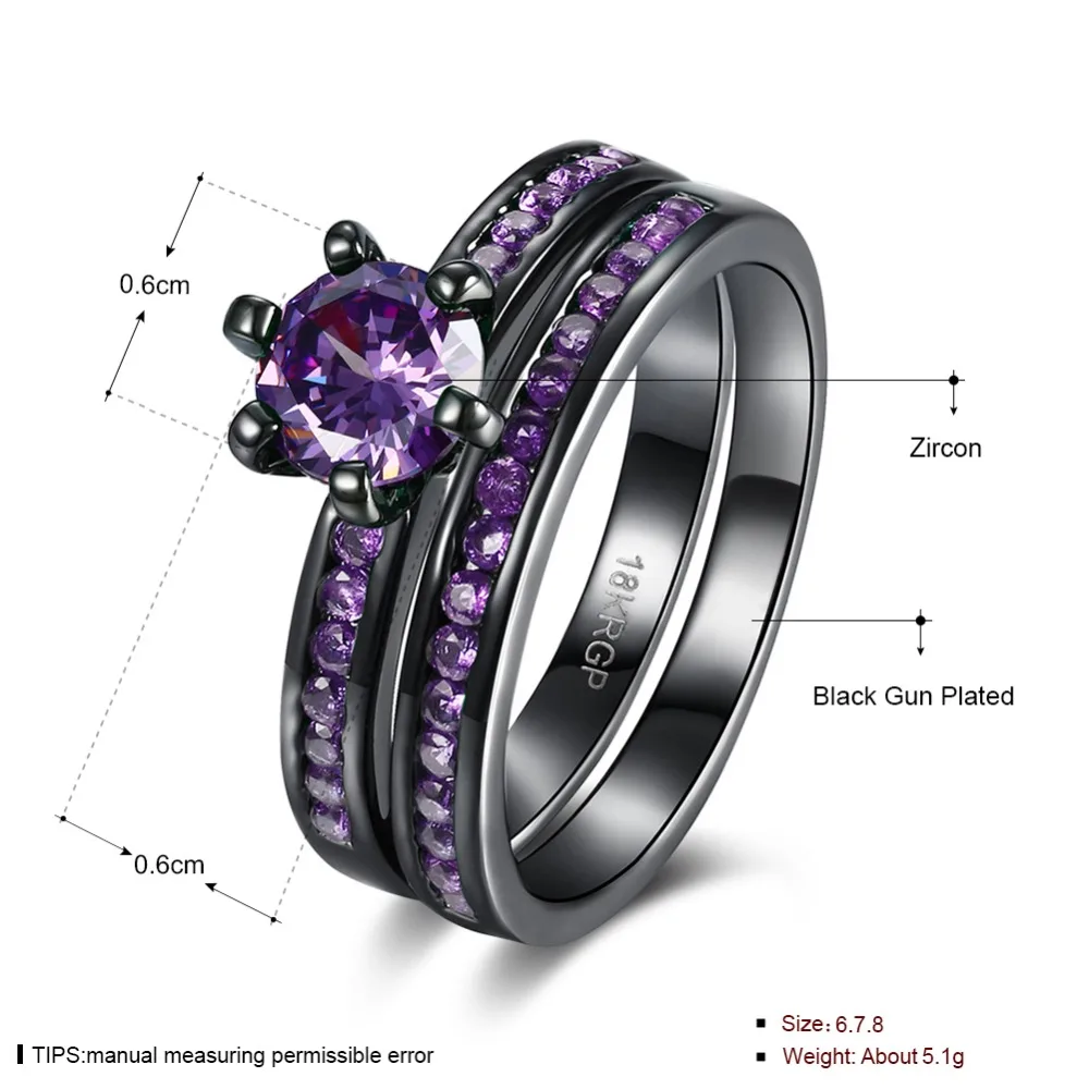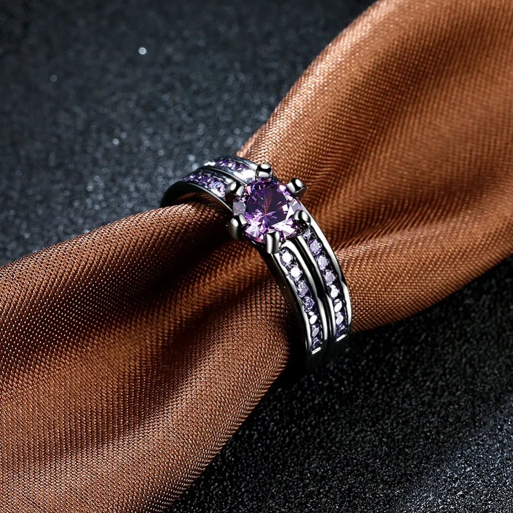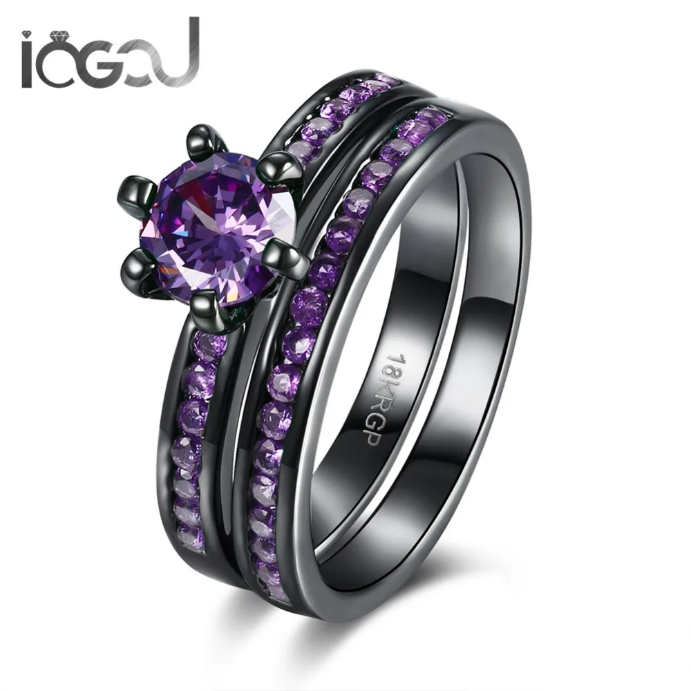 IOGOU Black Gun Plated Shunning Round Shaped Purple Stone Ladies Men Jewelry Wedding Bands Party En