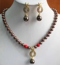 Hot Sale fine Lovely Wonderful Design 8mm Coffee Pearl Necklace+14mm Earring Pendant Jewelry Set gem women's